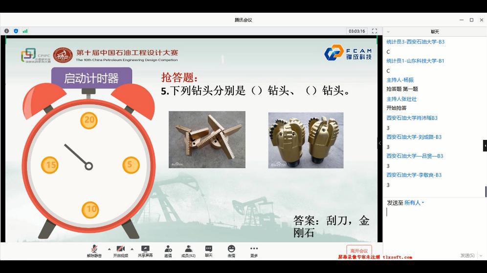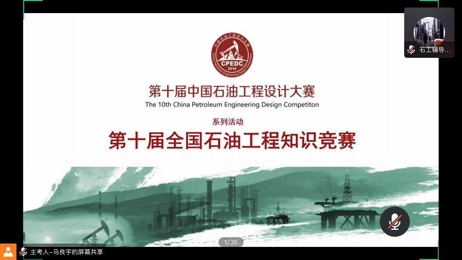 6月13日上午,第十届中国石油工程设计大赛系列活动之“宁波锋成杯”第十届全国石油工程知识竞赛在线开展。中国p站中文网站(北京)石油工程学院韩国庆教授、中国p站中文网站(华东)张卫东教授、东北p站中文网站曹广胜教授、燕山大学李子丰教授担任评委,赞助企业宁波锋成先进能源材料研究院副总经理余波、人力资源总监胡敏参加了活动,来自全国20所高校及科研院所的80名学生线上参加了比赛,500余名师生通过直播观看了比赛。
